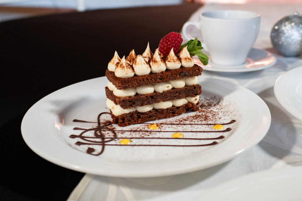 El Menú de Año Nuevo 2025-2026 inicia con un gravlax de salmón perfumado al Pernod, seguido de una crema de morillas perfumada al cognac, dos preparaciones ligadas al lujo gastronómico y a la idea de avanzar sin retroceder. Como plato fuerte se sirve un filete de res con salsa a las tres pimientas sobre puré de papa rústica y terrina de vegetales, y el final dulce llega con un brownie con esencia de tiramisú y una compota de queso mascarpone con frutos rojos, pensados como símbolos de dulzura y renovación.