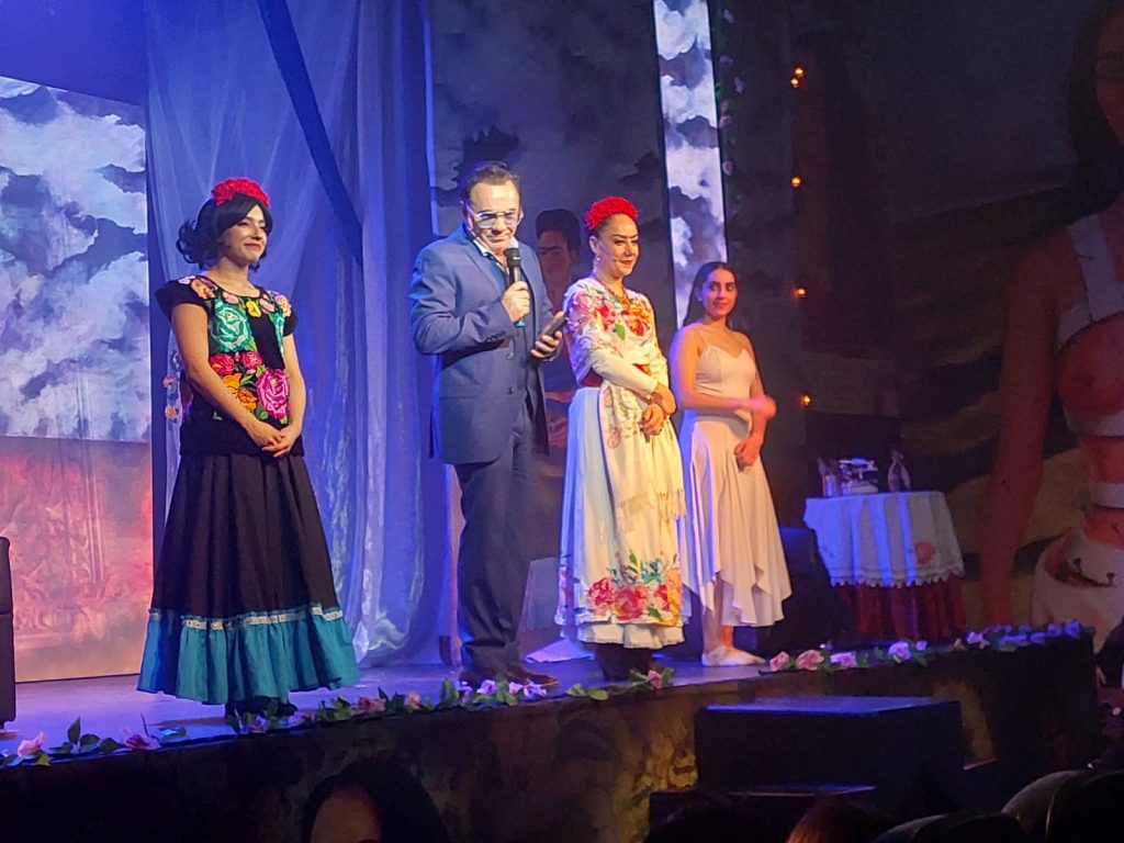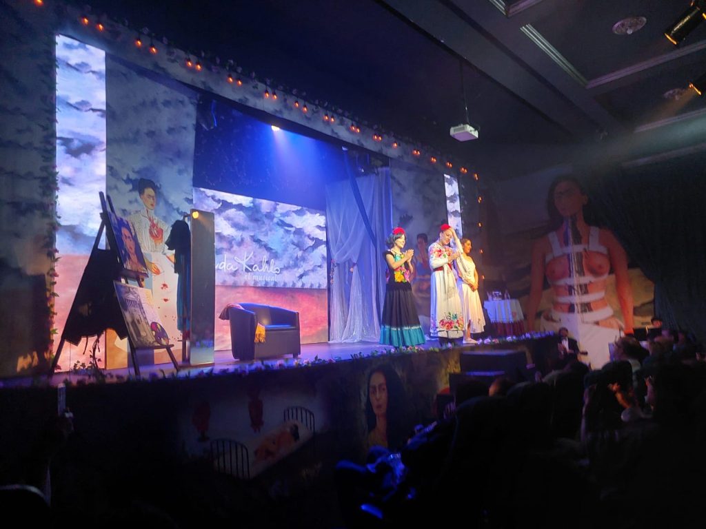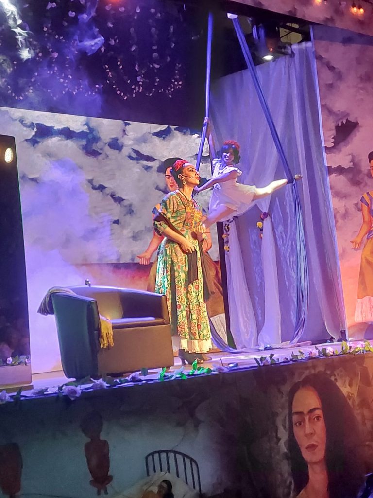 Desde el momento en que las luces se atenúan y la música en vivo comienza a sonar, el público es transportado al universo de Frida Kahlo. El escenario se convierte en un lienzo dinámico gracias al video mapping, que proyecta imágenes de sus obras y momentos clave de su vida, mientras la danza aérea añade una dimensión etérea a la narrativa. Esta combinación de elementos visuales y sonoros crea una atmósfera inmersiva que invita al espectador a adentrarse en la complejidad y pasión de una de las artistas más emblemáticas de México.