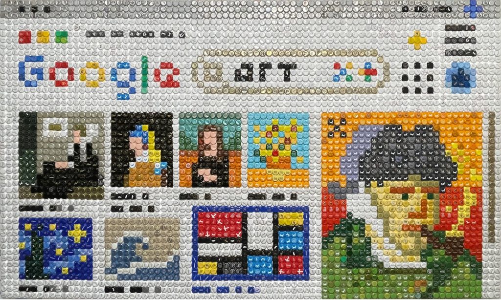 Una de las piezas más comentadas de la noche fue el autorretrato en mosaico digital, donde Santana emplea tapas de cerveza y códigos QR, fusionando materiales cotidianos con símbolos tecnológicos. Este autorretrato, más que una representación visual, es una declaración sobre la identidad en tiempos de hiperconexión.